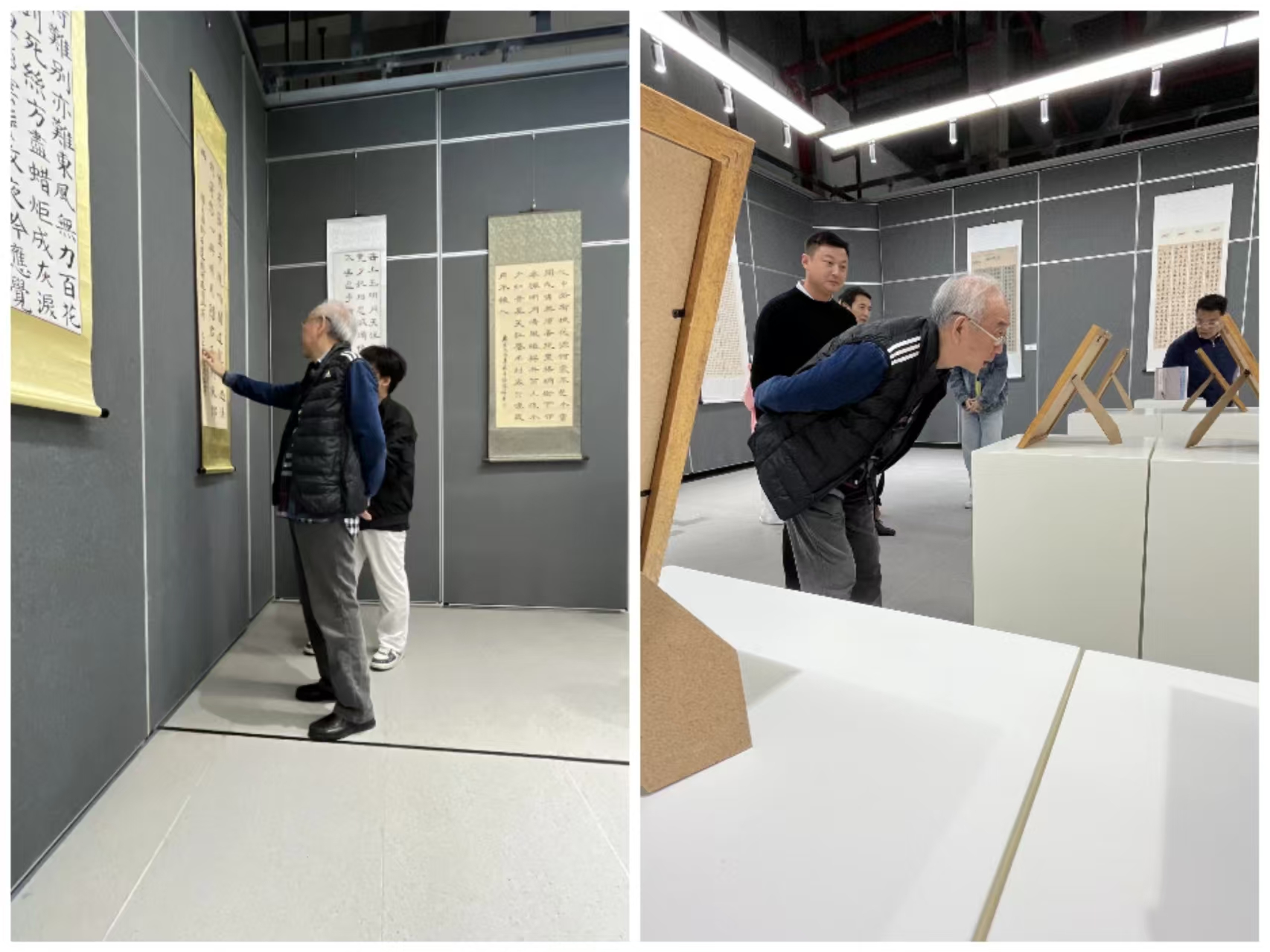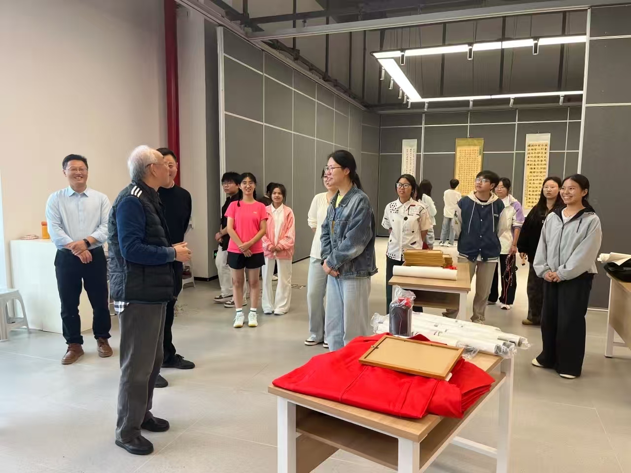 巡回展前夕校长陶也青莅临展馆,陶校长首先肯定了我校学生练习书法的刻苦,并对我校学生作品现场逐一指导并提出了改进建议,向同学们科普了近年出现的几种陶瓷刻,对技艺的要求更加高超,鼓励同学们努力练习书法技艺,在传承中创新进步。