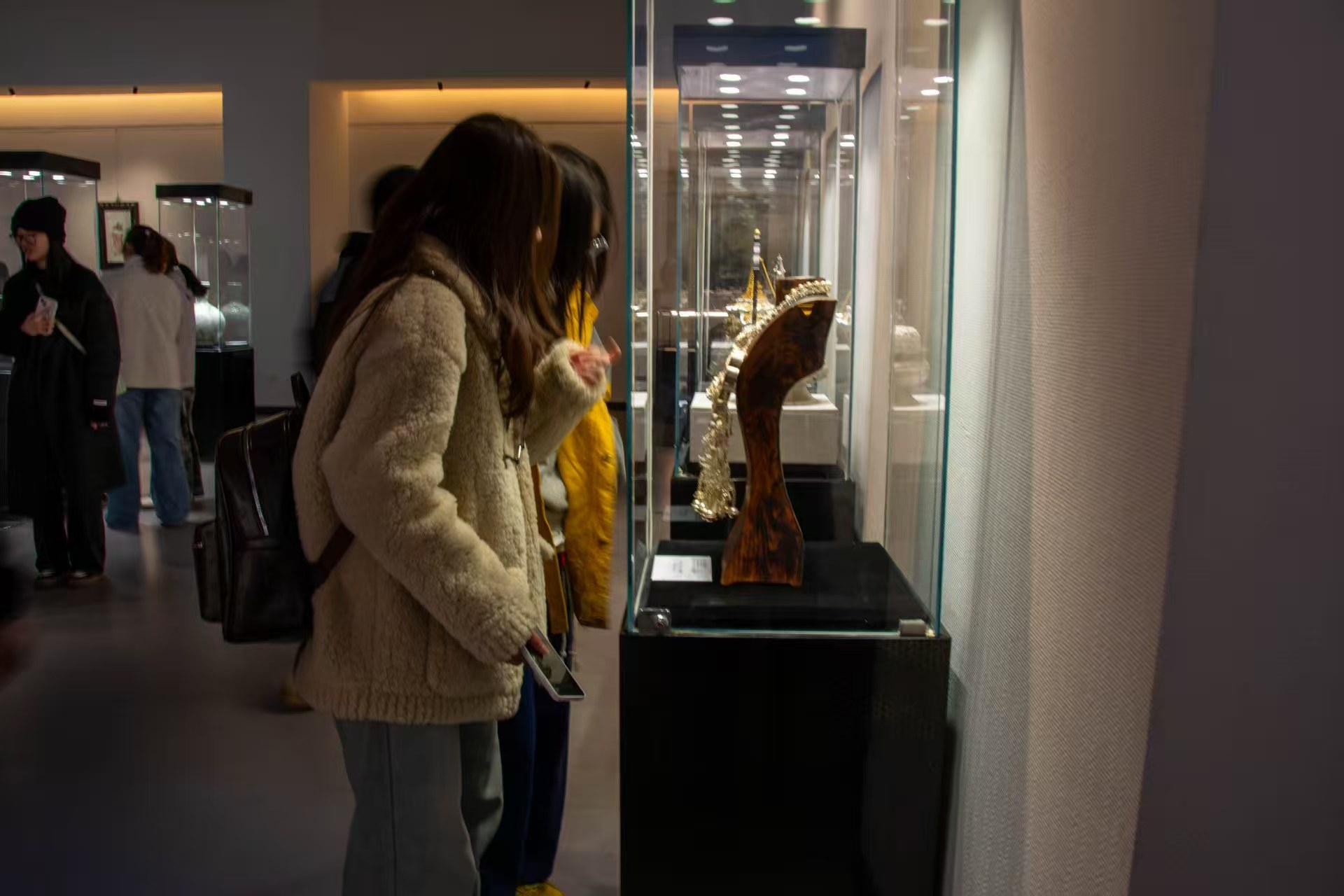 参观过程中,学员们循着展览脉络,逐一驻足欣赏古朴典雅的陶瓷器皿、瑰丽神秘的漆艺珍品、巧夺天工的雕刻佳作与精美绝伦的编织刺绣,不时和其他参观者交流探讨:时而聊作品的制作技巧,时而谈传统纹样的文化寓意,时而品精雕细琢的工艺细节,从纹样里读中华文化底蕴,从技艺中感匠人精神坚守。也深刻体会到中华工艺美术作为连接历史与当代的精神纽带,所蕴含的文化力量与美学价值,生动诠释了“格物致知”的哲学思想与“器以载道”的人文精神。